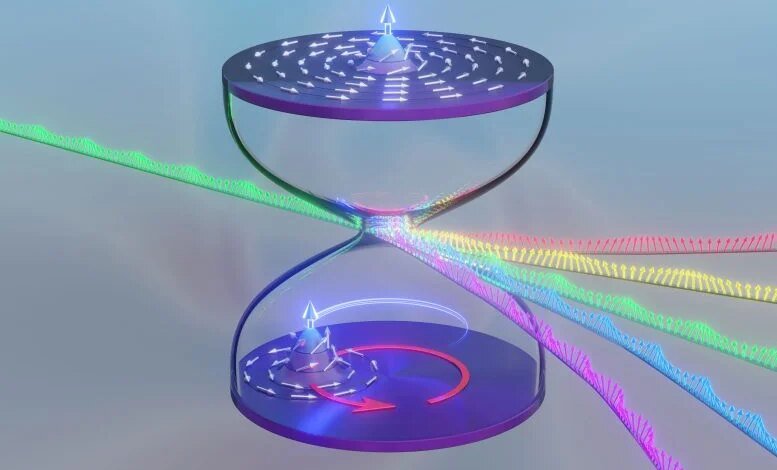 تنشأ الدوامات المغناطيسية في أقراص رقيقة للغاية بحجم ميكرون مصنوعة من مادة مغناطيسية مثل النيكل والحديد. داخل هذه الهياكل، تصطف العزوم المغناطيسية الفردية، غالبًا ما تُقارن بإبر البوصلة المجهرية، بشكل طبيعي في ترتيبات دائرية. عندما يتم إزعاج النظام من الخارج، يمكن أن تنتقل الموجات عبره بطريقة مشابهة لموجة حشد منسقة في الملعب. تتحرك كل لحظة مغناطيسية صغيرة قليلًا وتمرر حركتها إلى جارتها. يطلق الفيزيائيون على هذه الحركات الشبيهة بالموجة المشتركة اسم “المجنون”.